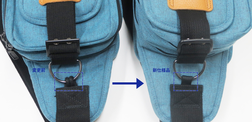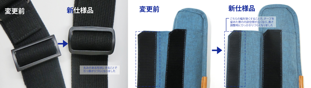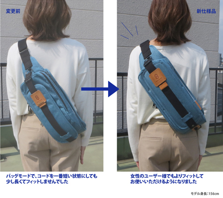 女性ユーザー様などからの「ショルダーベルトが少し長く、バッグモードの際に身体フィットしない」といったご意見をうけ、女性また小柄な方でもよりフィットするようショルダーベルトを短くしました。 |