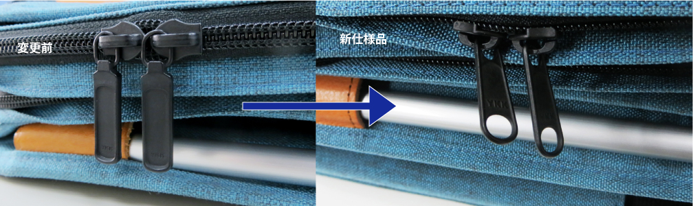 カバンの開け閉めを行うファスナー部分の引き手(スライダー)を穴あきタイプにいたします。(ベーシックのみ。2019.7月ロットよりコーデュラは穴なしタイプの引き手となります) |